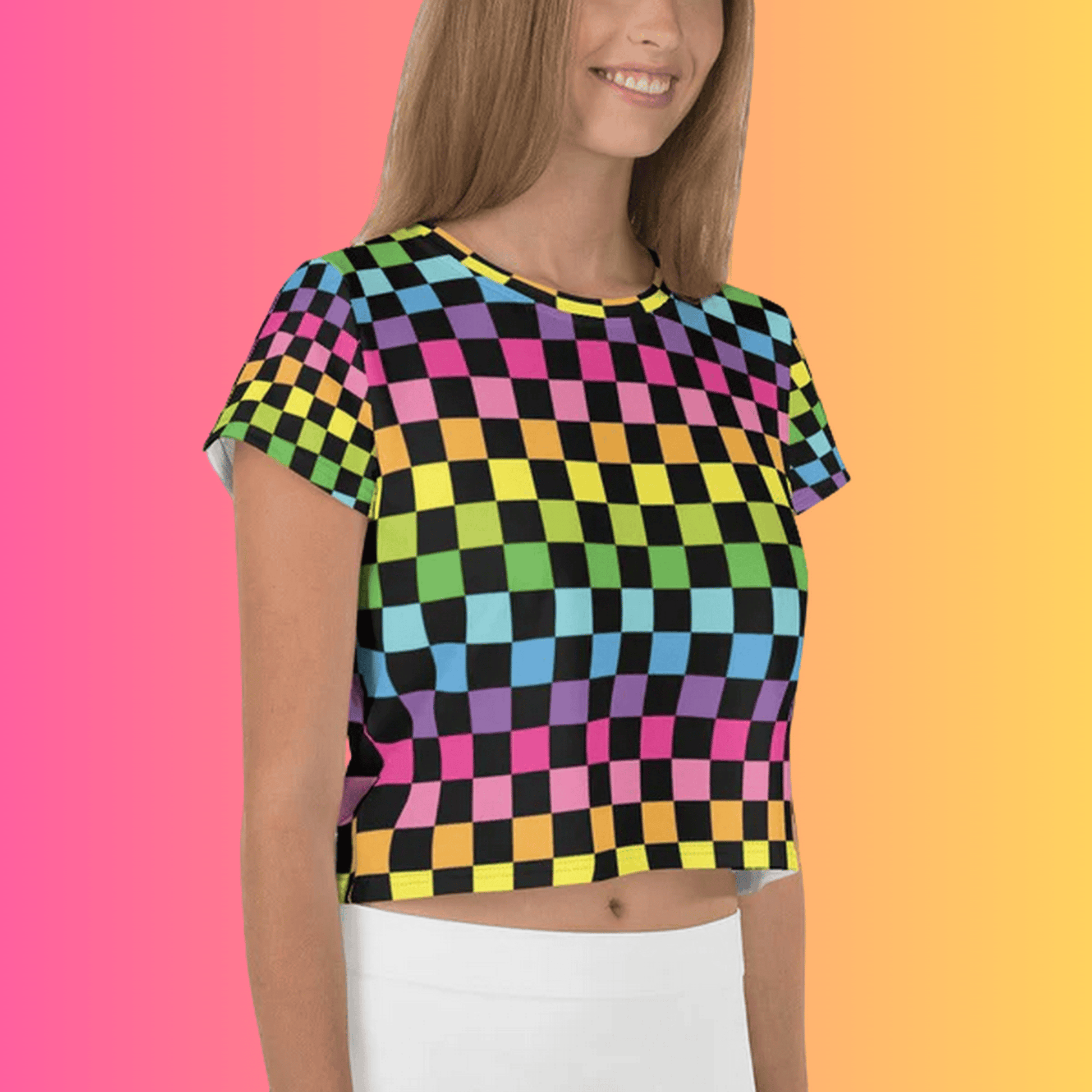 Vibrant Neon Checkered Crop Tee - Must-Have for Festival Vibes