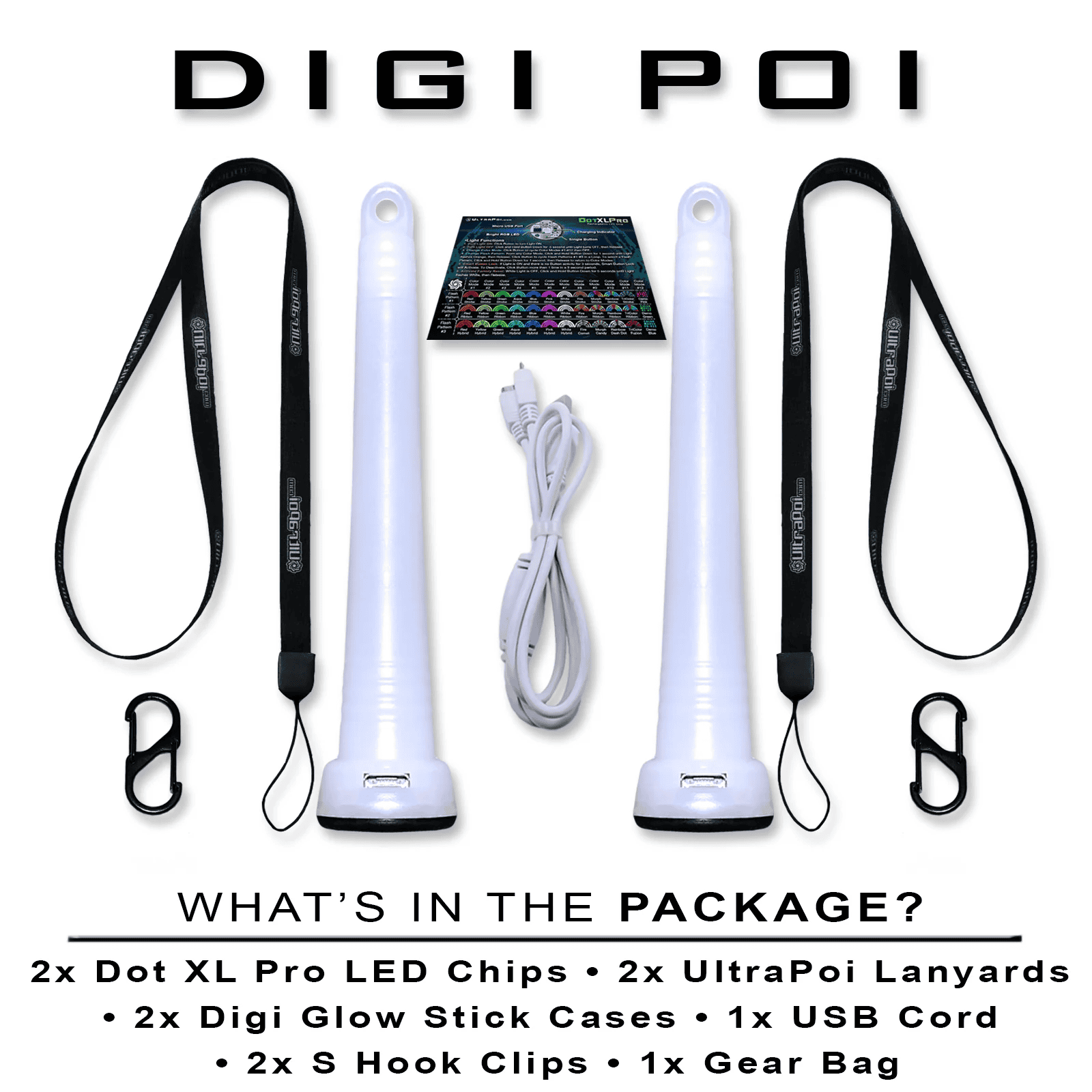 Kit Includes: 2x LED Digi GlowSticks , 2x Lanyard, 2x S Hook Clip, 1x Charging Cable, & 1x Gear Pouch.