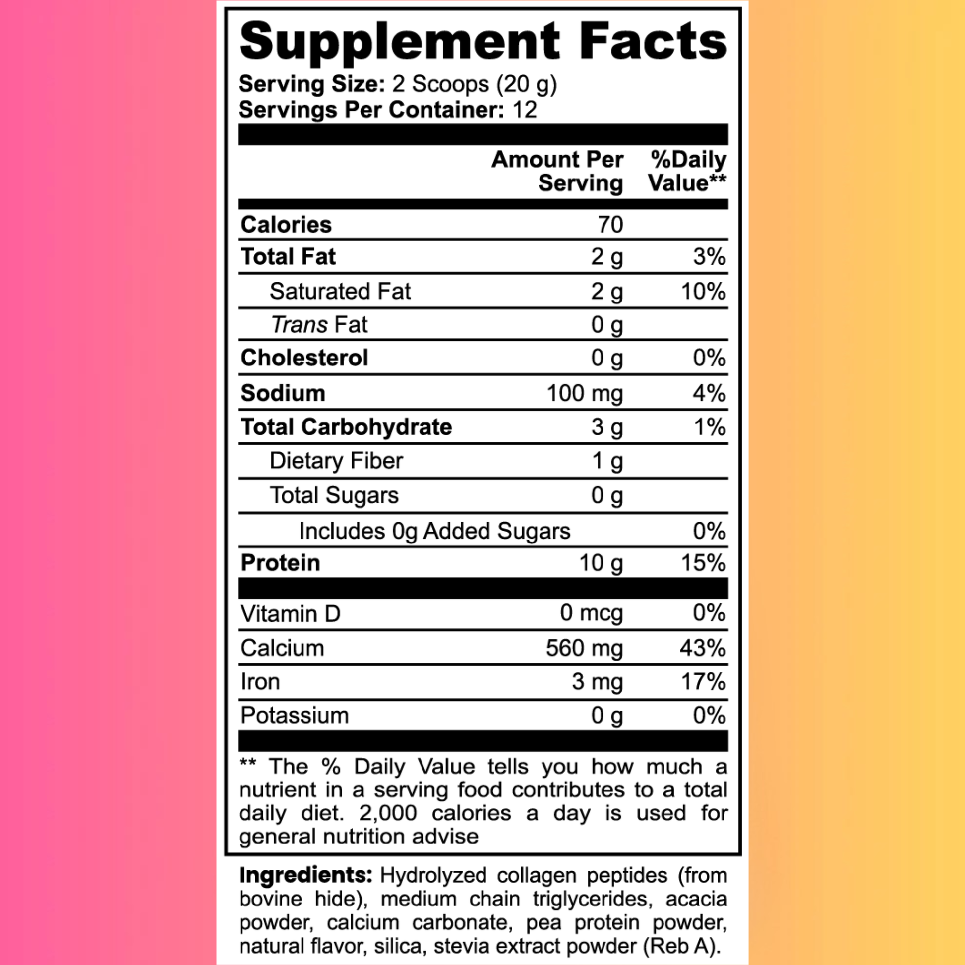 Ingredients: Hydrolyzed collagen peptides (from bovine hide), medium chain triglycerides, acacia powder, calcium carbonate, pea protein powder, natural flavor, silica, stevia extract powder.