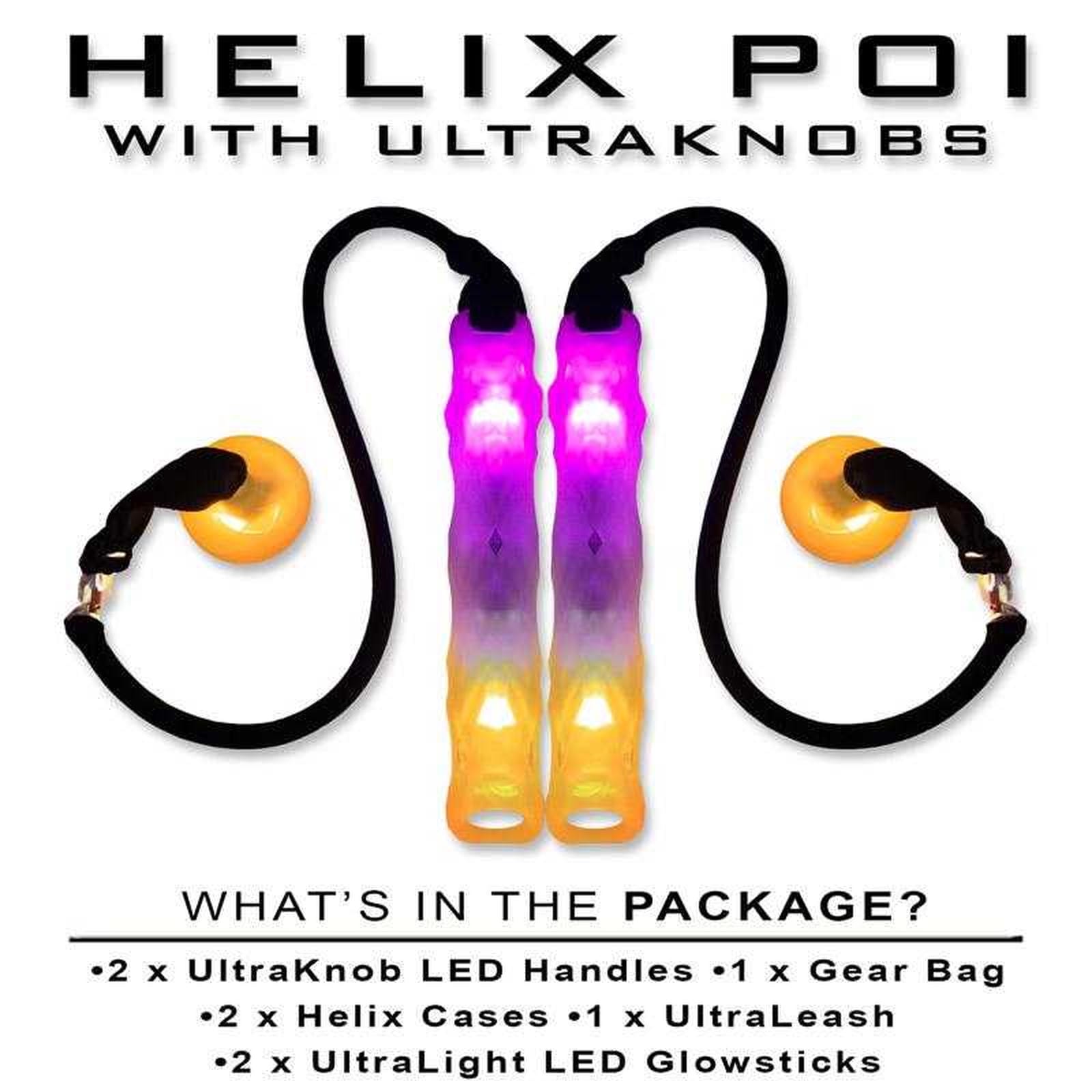 The standard helix poi set comes with silicone UltraGrips, which provide a sturdy grip during toss tricks. However, you can upgrade the UltraGrips to Ultraknobs, which are equally sturdy and easy to grip, but also light up with customizable LED colors. This adds another source of light for you to use when creating light trails.