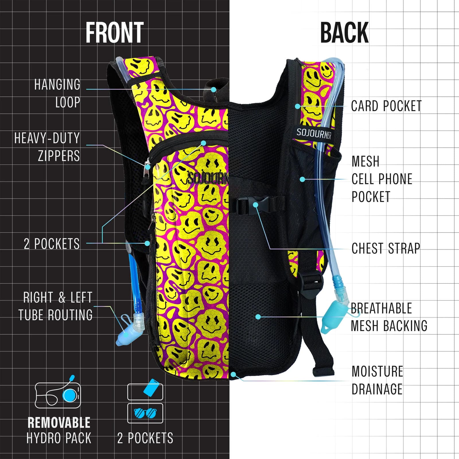 - FUN DESIGNS & COLORS = If you are tired of boring hydration pack backpacks, then our bright colors, unique styles & patterns are for you. Stand out at your next music festival, rave, edm or edc event with our rave essentials.