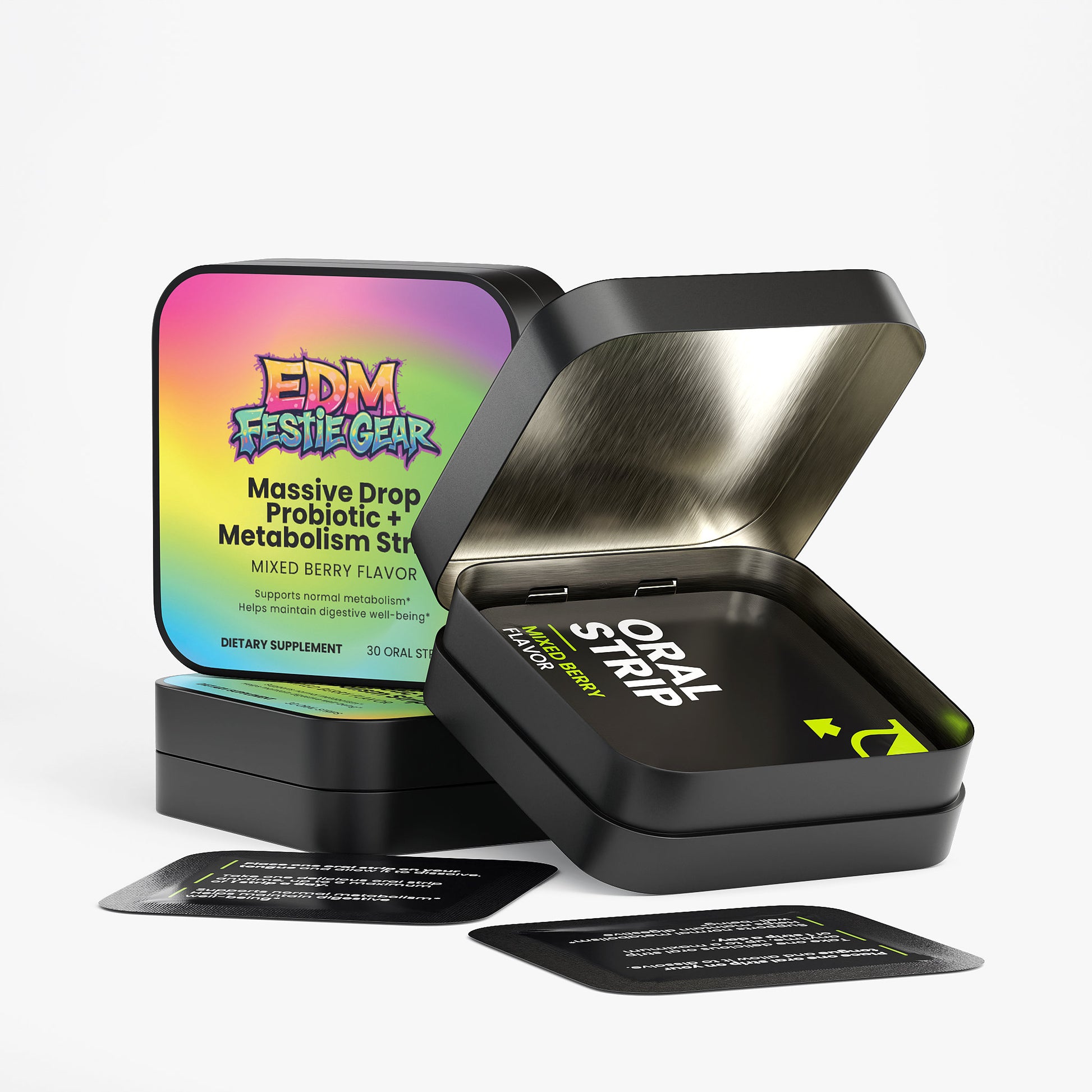 Massive Drop Probiotic + Metabolism Strips Feel the energy surge with strips that keep your gut thriving and your metabolism firing on all cylinders. Packed with probiotics to support digestive wellness and metabolism-boosting ingredients, these strips dissolve instantly for fast-acting support when you need it most. No water required—just drop and go. Perfect for festival season, late-night sets, or whenever you're pushing your limits. Keep your body in sync with your vibe and dance all night long.