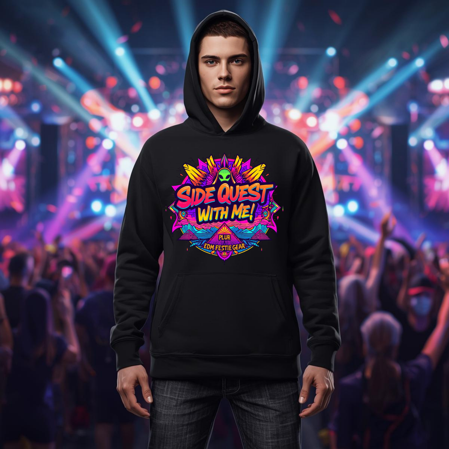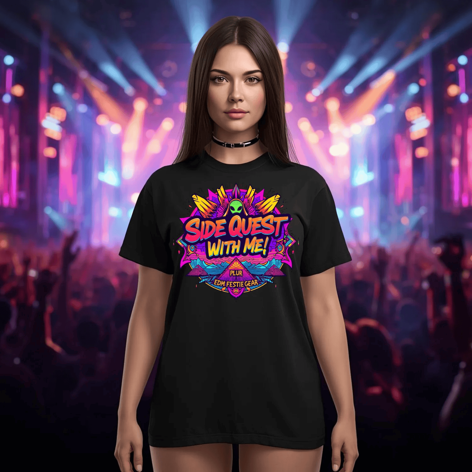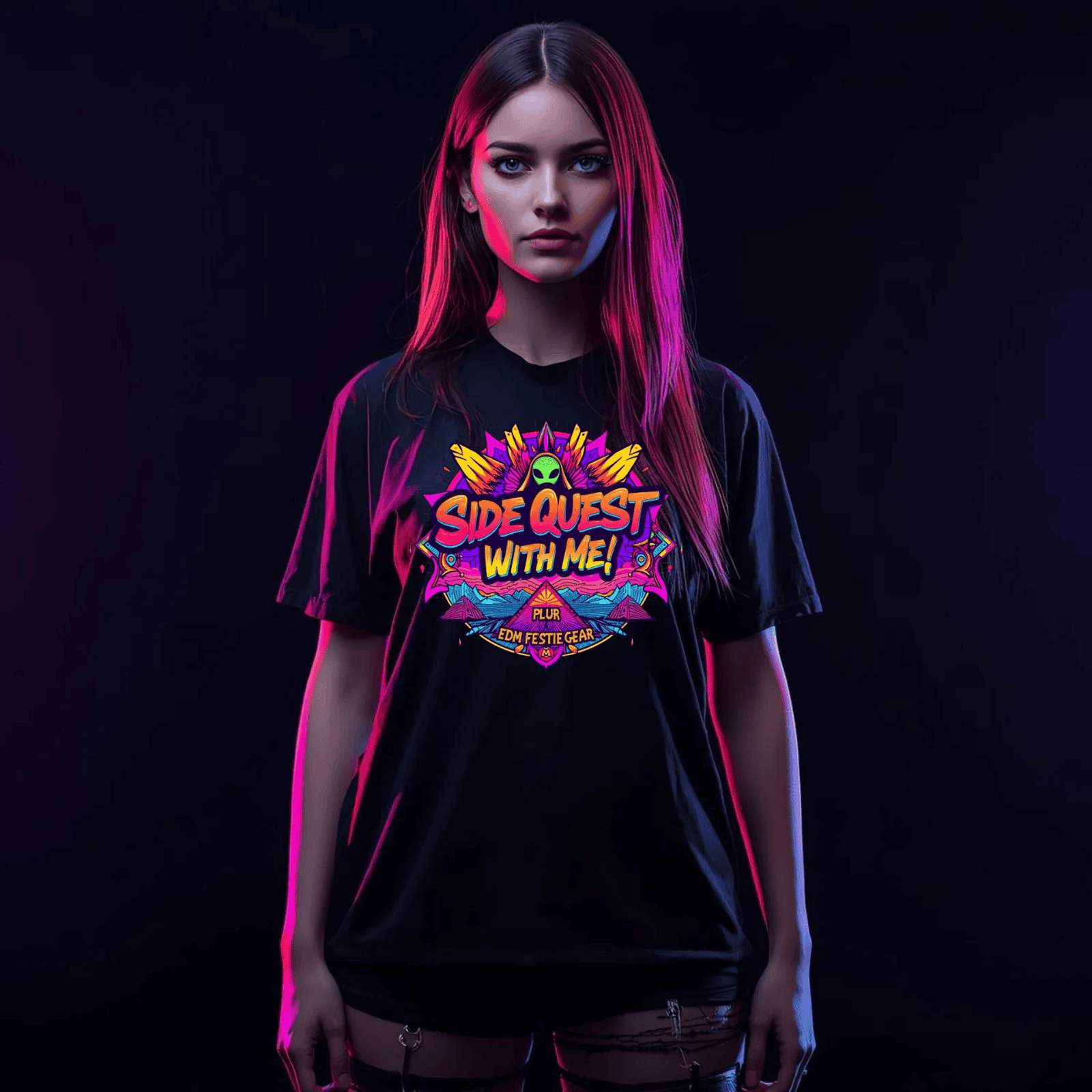 Step onto the dance floor and into the cosmos with the Side Quest With Me Aliens T-Shirt, your ultimate festival companion! This shirt isn’t just clothing; it’s a statement. Perfectly crafted for those who embrace the vibrant energy of the rave scene, it features eye-catching alien graphics and otherworldly designs that celebrate the extraordinary aspects of festival culture.