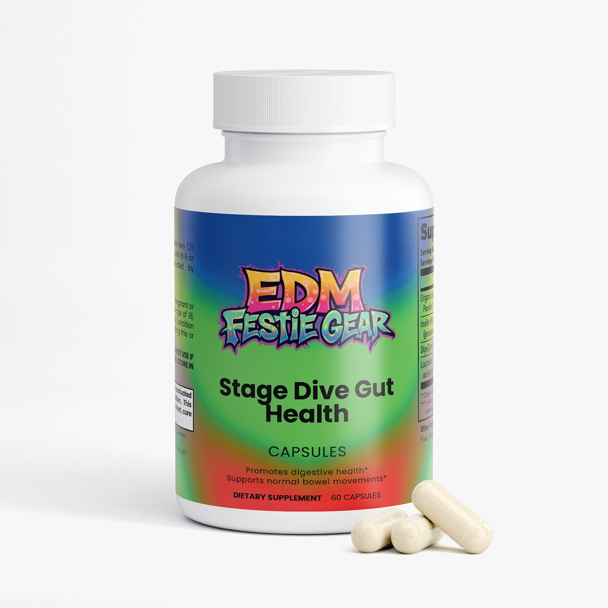 Stage Dive Gut Health Drop the beat on your digestive system with Stage Dive Gut Health—your all-access pass to feeling incredible from the inside out. Packed with premium probiotics and gut-supporting ingredients, this formula keeps your microbiome vibing all night long and into the next day. Whether you're dancing through a festival weekend or crushing your daily grind, a healthy gut means more energy, better digestion, and that unstoppable festival energy you crave. Get in the pit, feel the bass, and let your gut thrive. Your body will thank you when the music stops.